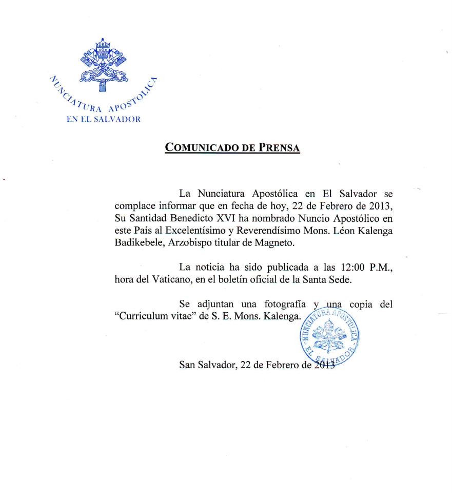 En día de hoy viernes 22 de febrero del 2013 en la Ciudad del Vaticano, el Santo Padre Benedicto XVI ha nombrado al arzobispo Mons. León Kalenga Badkibele como nuncio apostólico en El Salvador. El arzobispo era hasta ahora nuncio apostólico en Ghana según leemos en el portal web de noticias oficial del vaticano http://www.news.va.